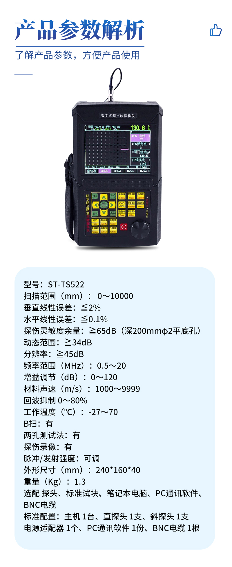 選配 | 探頭、標準試塊、筆記本電腦、PC通訊軟件、BNC電纜 |