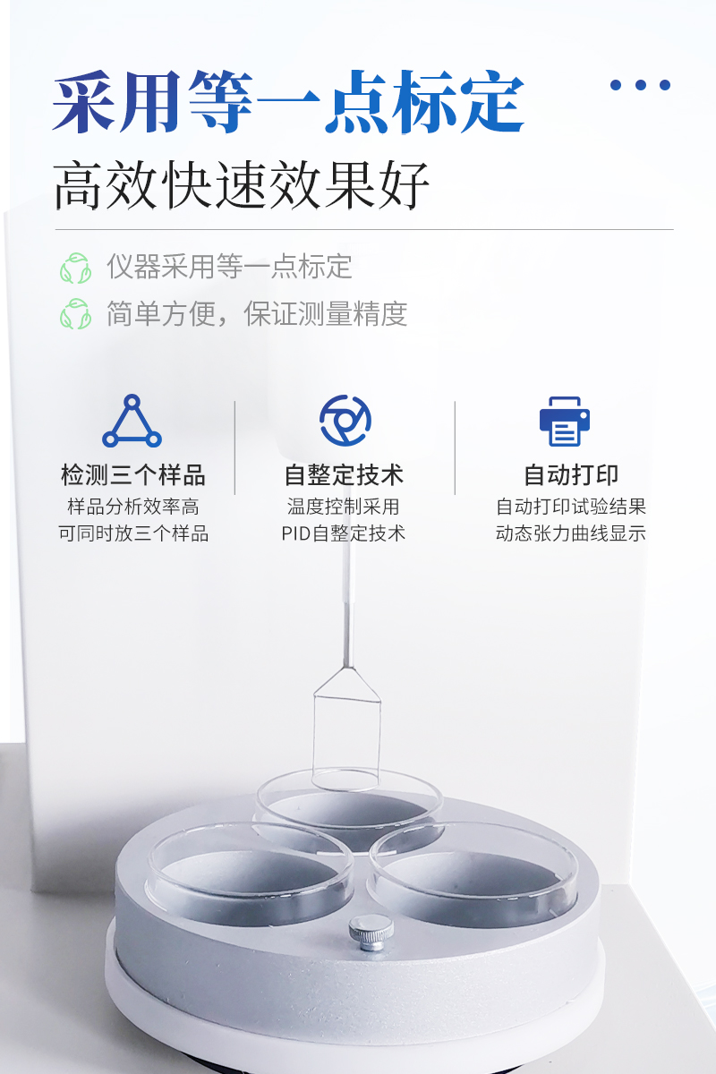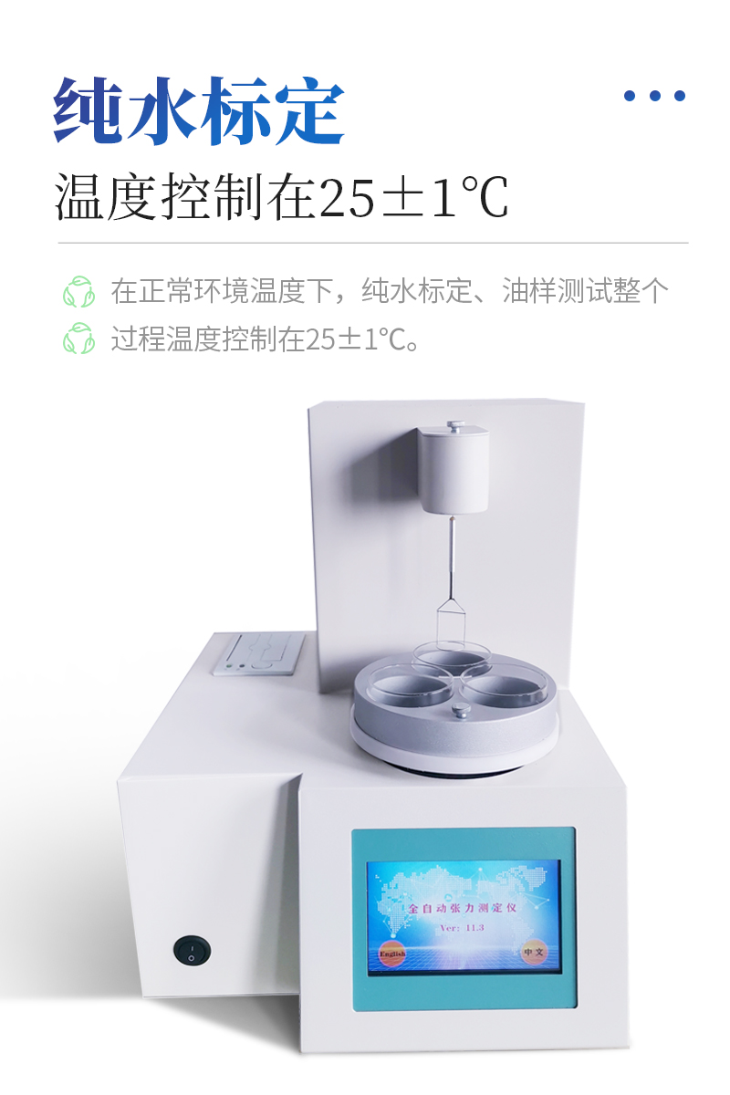 儀器特點★ 在正常環(huán)境溫度下,純水標定、油樣測試整個過程溫度控制在25±1℃。★ 溫度控制采用PID自整定技術(shù)★ 樣品分析效率高,可同時放三個樣品★ 使用不同測量環(huán)儀器自動修正參數(shù)★ 自動打印試驗結(jié)果,動態(tài)張力曲線顯示★儀器采用等一點標定,簡單方便,保證測量精度;★高清晰彩色觸摸