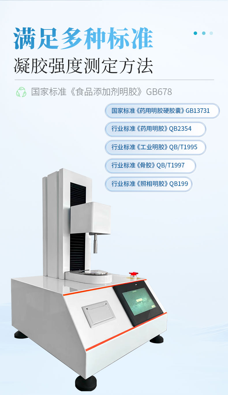 凝膠強(qiáng)度測儀適用于凝膠、果膠、硅膠、結(jié)冷膠、卡拉膠、瓊脂、阿拉伯膠、黃原膠、魔芋膠和瓜爾膠等的破裂強(qiáng)度、彈性、延展性、拉伸強(qiáng)度、粘附度、回復(fù)性等測試。凝膠強(qiáng)度測儀也叫凍力強(qiáng)度儀 ,明膠凝凍強(qiáng)度測定儀,組織分析儀或凍力測試儀。