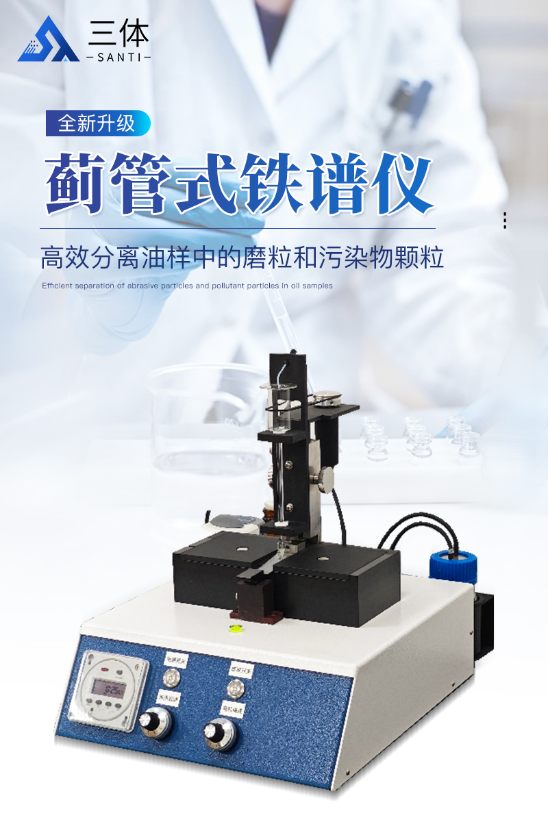 薊管式鐵譜儀是一套完整的鐵譜分析系統(tǒng),用以分離和評(píng)定在用潤(rùn)滑油、液壓油、冷卻液或燃油中的磨損顆粒和污染物顆粒,由薊管式鐵譜儀、顯微鏡、工業(yè)攝像頭、加熱盤(pán)(可選)和圖像采集軟件組成。為了確保譜片的制作質(zhì)量,經(jīng)稀釋處理后的被測(cè)油液在自身重力作用下直接通過(guò)薊型管,勻速流過(guò)鐵譜譜片,油液中鐵磁性顆粒在磁場(chǎng)作用下被沉積到譜片上,有效避免了制譜過(guò)程中外界作用力對(duì)磨粒造成的破損、變形等傷害;通過(guò)控制清洗劑的流量和流速,對(duì)譜片進(jìn)行徹底沖洗;譜片干燥后進(jìn)行分析。將制備好的譜片平穩(wěn)的放在顯微鏡的載樣臺(tái),通過(guò)使用顯微鏡的透射光、反射光、偏振光、紅綠光源以及譜片加熱等分析手段,參照標(biāo)準(zhǔn)的磨粒圖譜,對(duì)磨損顆粒進(jìn)行深入分析。