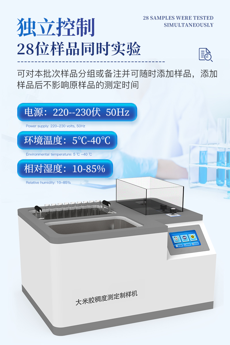 1、用途:適用于糧油檢測大米膠稠度的測量配套設(shè)備,滿足GB/T22294-2008標(biāo)準(zhǔn)要求。2、工作條件:2.1電源:220--230伏, 50Hz;環(huán)境溫度:5℃-40℃;相對濕度:10-85%3、技術(shù)指標(biāo)要求★全樣品位:28位,★可同時滿足制膠過程和冰水浴操作。制膠和冰水浴可在屏上獨立操控,互不影響。★制膠控