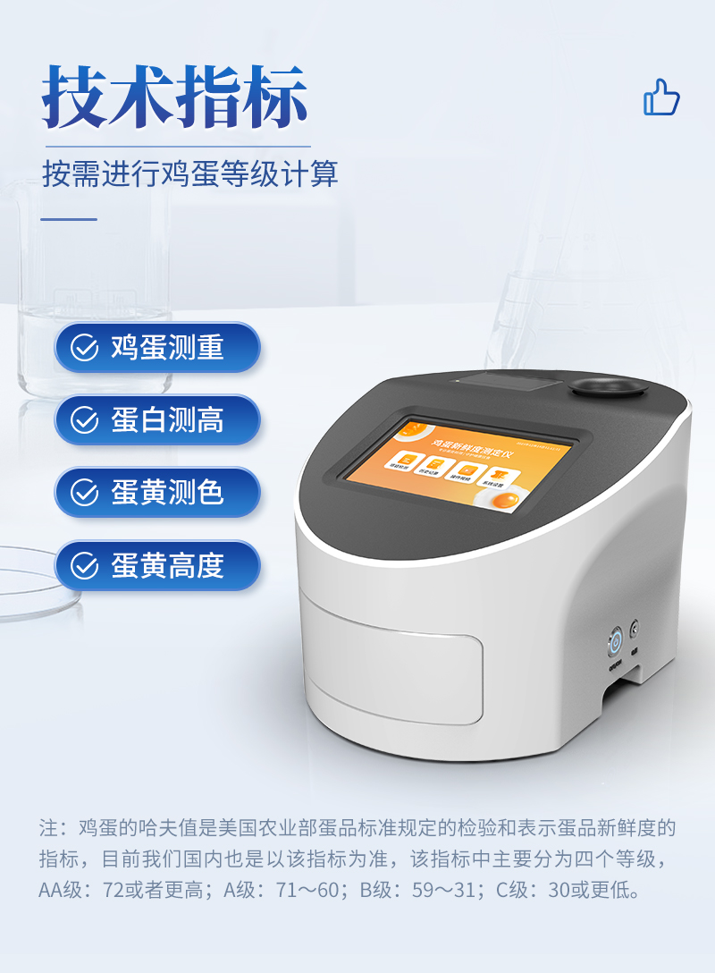 雞蛋品質(zhì)分析儀技術(shù)指標(biāo):雞蛋測(cè)重,蛋白測(cè)高,蛋黃測(cè)色,哈夫值顯示,蛋黃高度等,可進(jìn)行雞蛋等級(jí)計(jì)算。雞蛋的哈夫值是美國(guó)農(nóng)業(yè)部蛋品標(biāo)準(zhǔn)規(guī)定的檢驗(yàn)和表示蛋品新鮮度的指標(biāo),目前我們國(guó)內(nèi)也是以該指標(biāo)為準(zhǔn),該指標(biāo)中主要分為四個(gè)等級(jí),AA級(jí):72或者更高;A級(jí):71~60;B級(jí):59~31;C級(jí):30或更低。