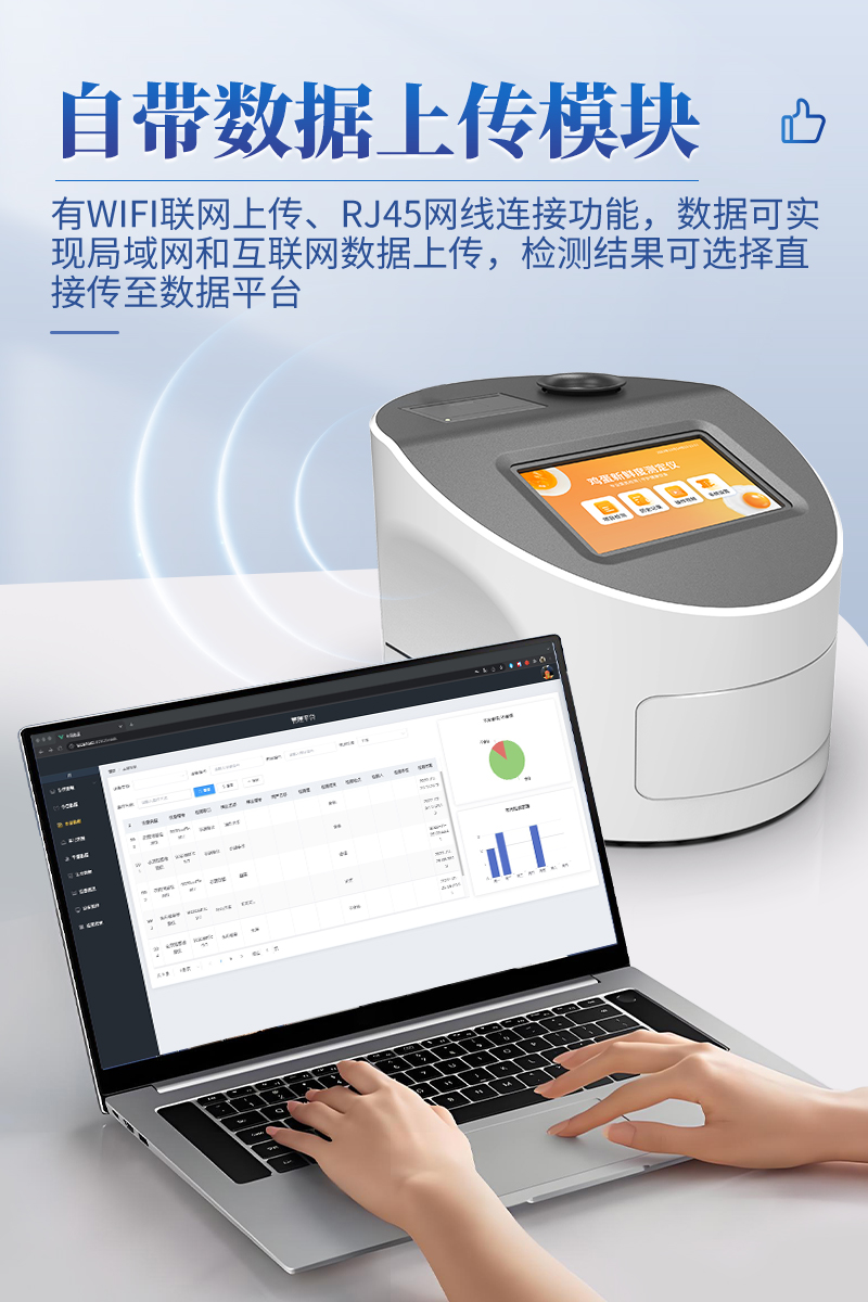 7.儀器可本機(jī)存儲(chǔ)數(shù)據(jù),可連接USB端口將數(shù)據(jù)導(dǎo)出存儲(chǔ)。另外,儀器自帶數(shù)據(jù)上傳模塊,具有WIFI聯(lián)網(wǎng)上傳、RJ45網(wǎng)線(xiàn)連接功能,數(shù)據(jù)可實(shí)現(xiàn)局域網(wǎng)和互聯(lián)網(wǎng)數(shù)據(jù)上傳,檢測(cè)結(jié)果可選擇直接傳至數(shù)據(jù)平臺(tái),進(jìn)行大數(shù)據(jù)分析處理與數(shù)據(jù)統(tǒng)計(jì),達(dá)到長(zhǎng)期分析監(jiān)測(cè)的目的。