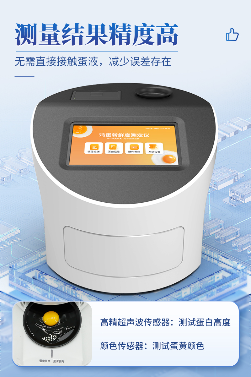 4.創(chuàng)新采用高精超聲波傳感器測(cè)試蛋白高度,精密傳感器測(cè)試蛋黃顏色,無(wú)需直接接觸蛋液,減少誤差存在。