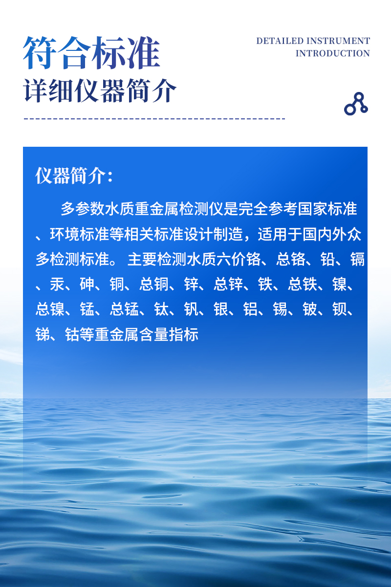 多參數(shù)水質(zhì)重金屬檢測儀是完全參考國家標(biāo)準(zhǔn)、環(huán)境標(biāo)準(zhǔn)等相關(guān)標(biāo)準(zhǔn)設(shè)計制造,適用于國內(nèi)外眾多檢測標(biāo)準(zhǔn)。 主要檢測水質(zhì)六價鉻、總鉻、鉛、鎘、汞、砷、銅、總銅、鋅、總鋅、鐵、總鐵、鎳、總鎳、錳、總錳、鈦、釩、銀、鋁、錫、鈹、鋇、銻、鈷等重金屬含量指標(biāo);本儀器兼具智能數(shù)據(jù)分析功能,圖表、列表顯示數(shù)據(jù),分析一目了然;高清晰度彩色液晶觸摸顯示屏,Android智能操作系統(tǒng),中文顯示界面,中英文鍵盤,人性化操作,使用更簡單。