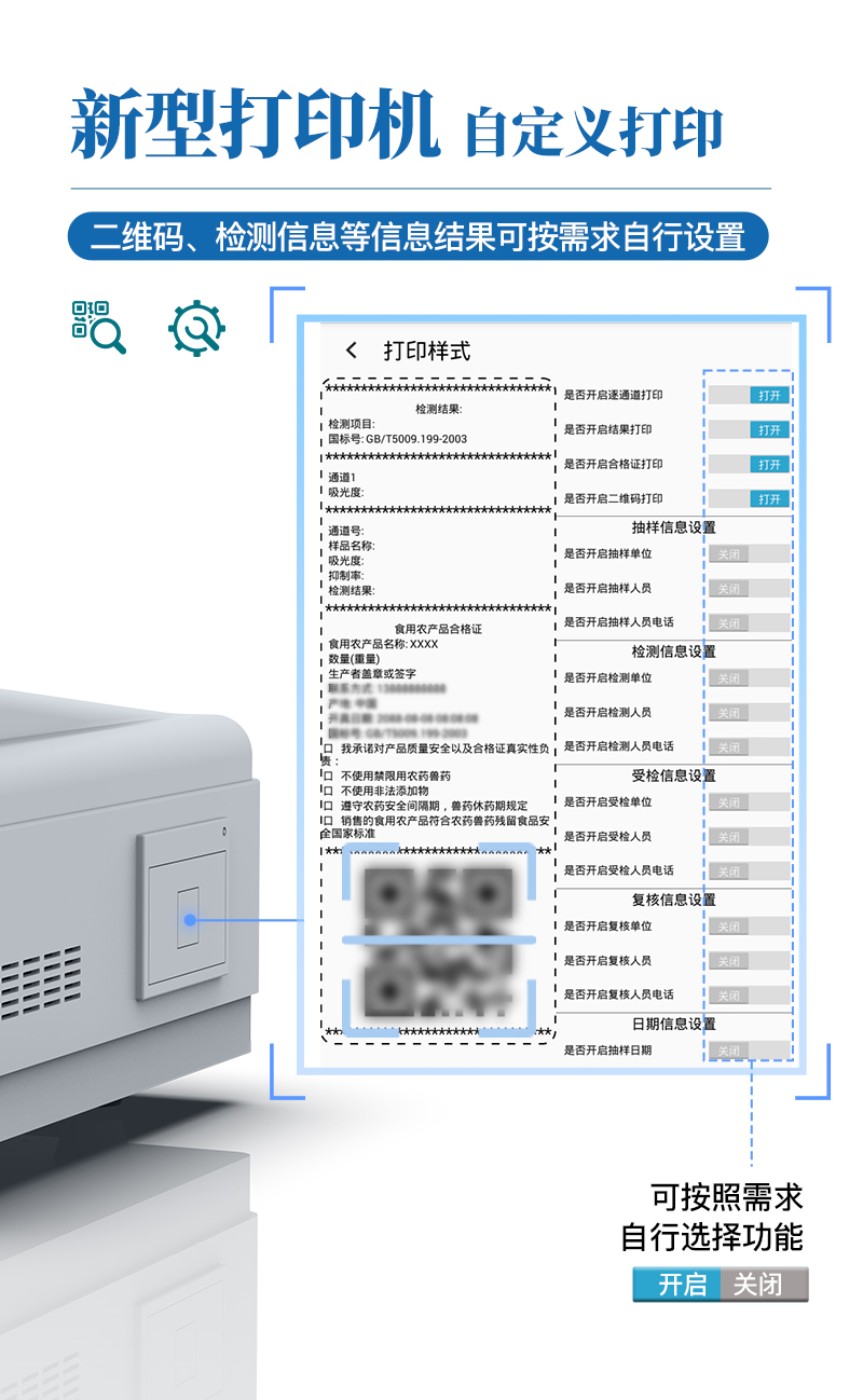 9.7.1、全新打印系統(tǒng):內置全新打印機,新創(chuàng)自定義打印方式,可按需靈活勾選控制:二維碼,抽樣信息、檢測信息,受檢信息、復核信息、抽樣日期、檢測日期等信息的打印。