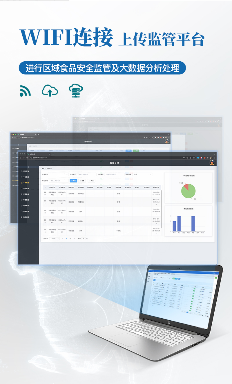 9.6、數(shù)據(jù)監(jiān)管系統(tǒng):同步對接監(jiān)管平臺,數(shù)據(jù)可局域網(wǎng)和互聯(lián)網(wǎng)數(shù)據(jù)上傳,檢測結果可選擇直接傳至食品安全監(jiān)管平臺。進行區(qū)域食品安全監(jiān)管及大數(shù)據(jù)分析處理與數(shù)據(jù)統(tǒng)計,檢測區(qū)域食品安全長短期動態(tài),達到食品安全問題預估、預警。